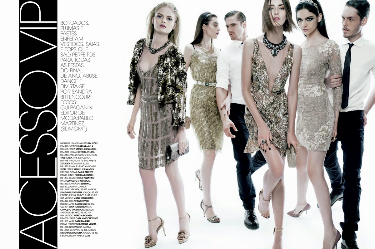 Cristina Herrmann, David Martins [MEGA], Indaia Lara, Isabella Melo, Natan Machado [FORD] e Nathalia Oliveira, em fotos de Gui Paganini, edição de moda de Paulo Martinez e make&hair de Daniel Hernandez, no editorial "Acesso VIP" da edição de dezembro da revista Marie Claire Brasil.